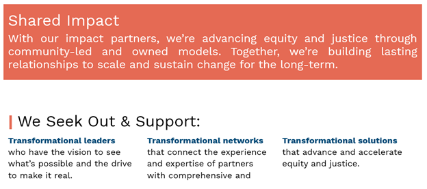 We do this by seeking out and supporting community leaders who have the vision to see what’s possible and the drive to make that real; connecting the experience of partners with comprehensive and flexible supports for shared learning and impact; and investing in innovative ideas and adaptive solutions that can spark and scale change for all.